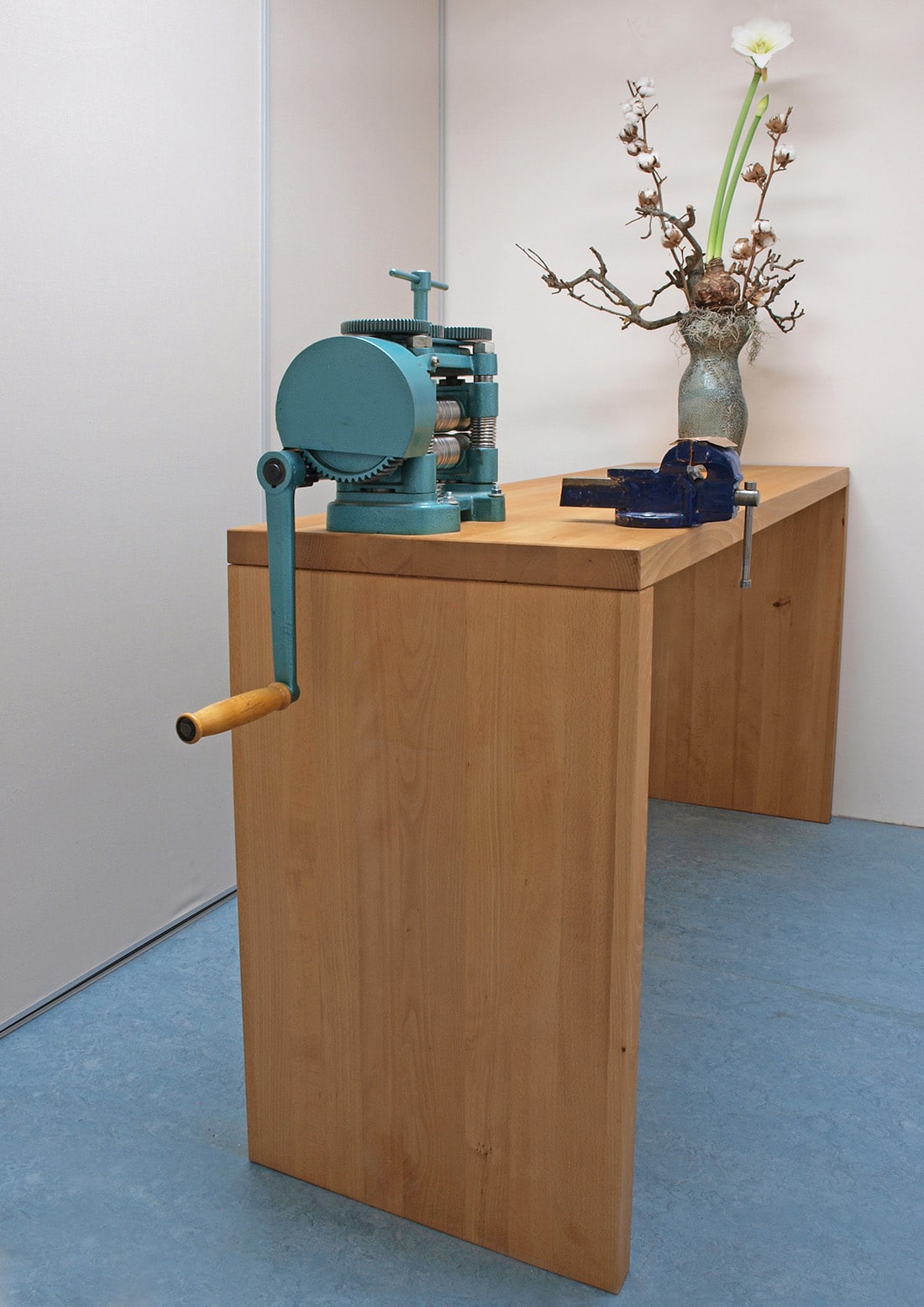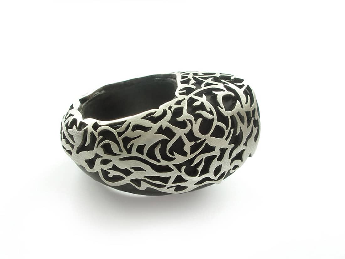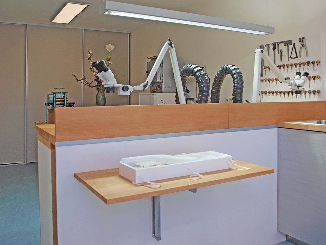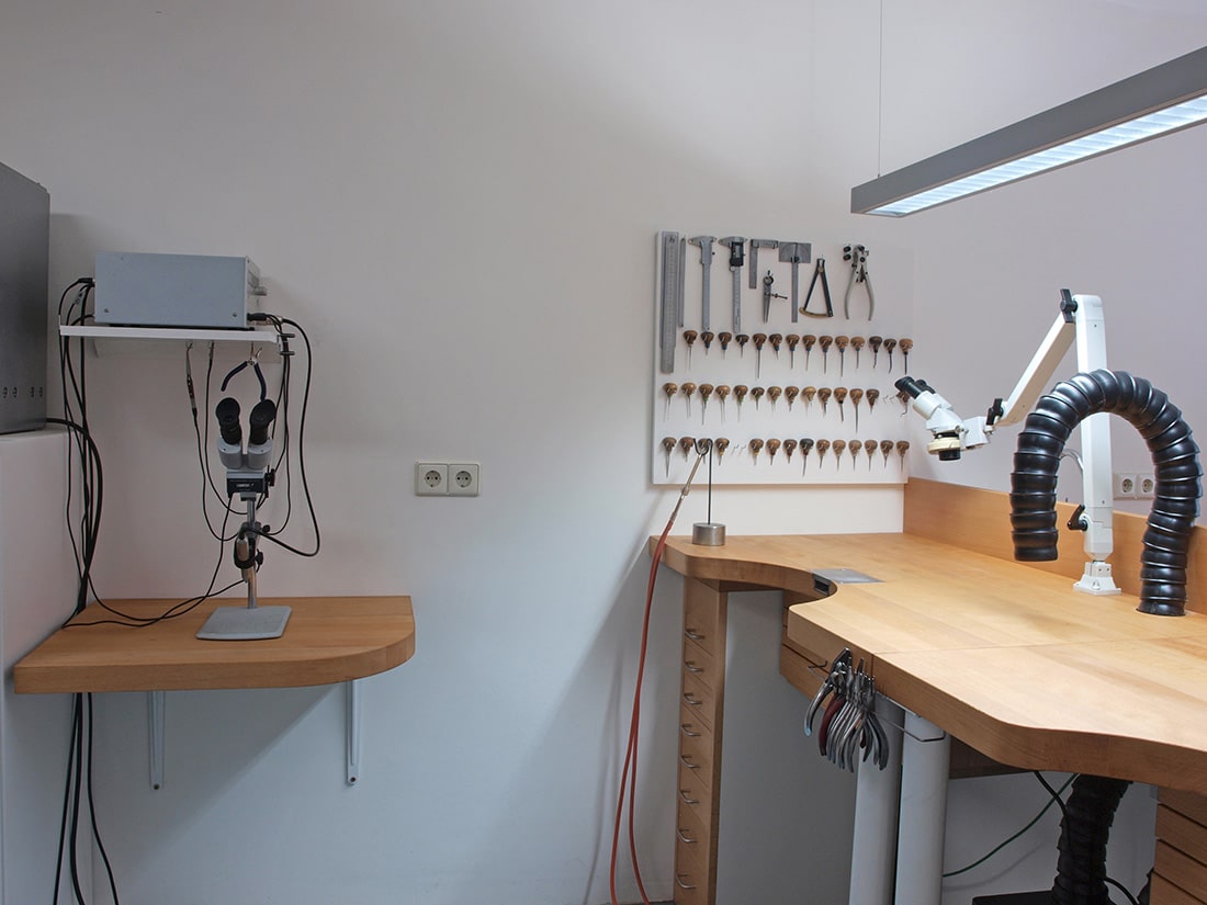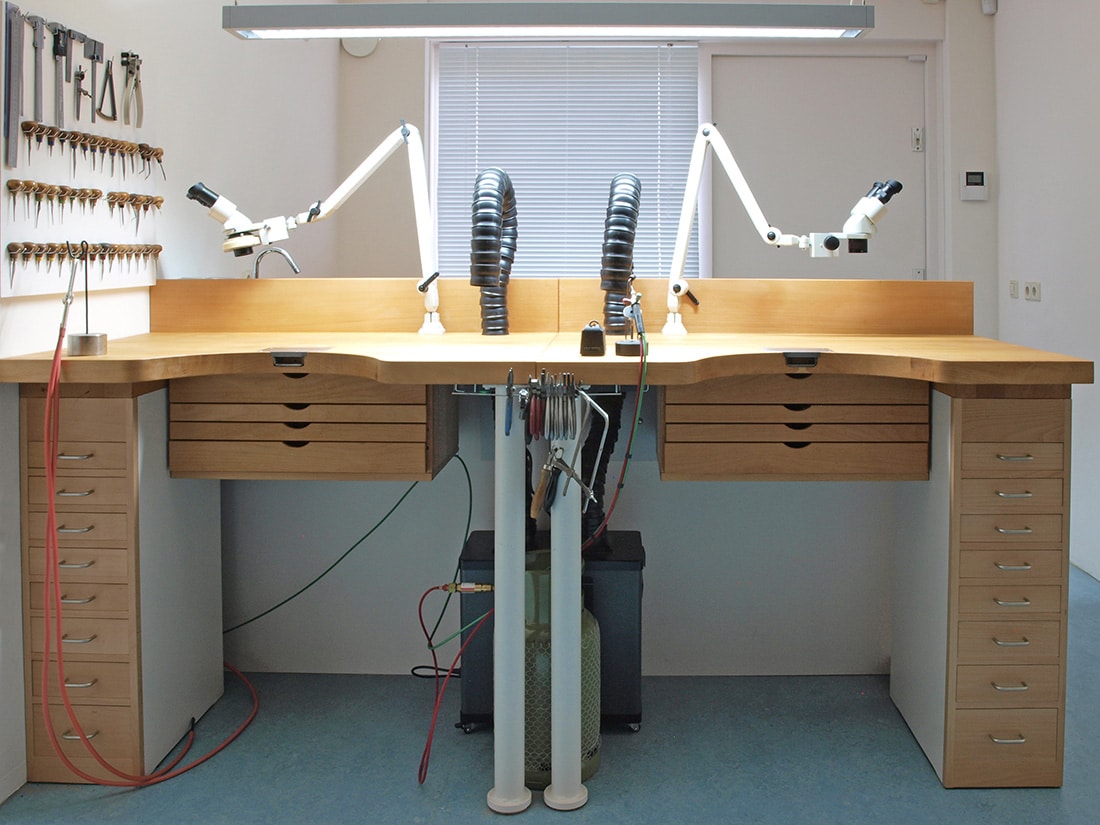 Geinspireerd door organische vormen creëert zij unieke sieraden en natuurlijk doet zij dit op een werkplek die is gemaakt door haar broer Pieter. De ergonomisch gevormde werkbank is een kunstwerk op zich en het is niet vreemd dat deze omgeving tot bijzondere ontwerpen inspireert.